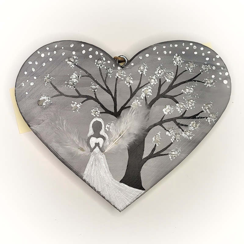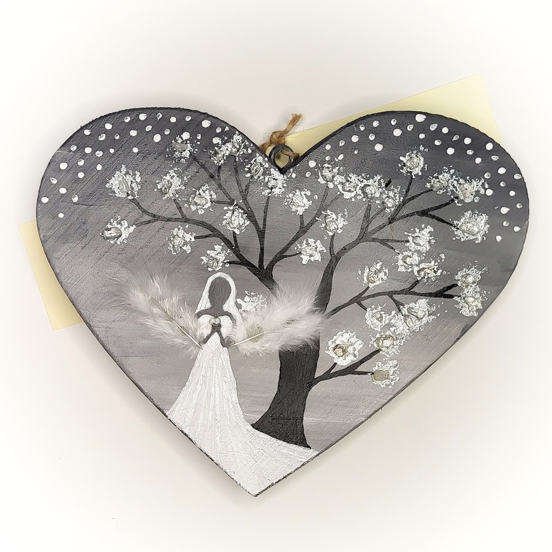Andělský strom života na srdíčku ze smrkového dřeva o tloušťce 2 cm a velikosti 19,5 x 16 cm je malovaný akrylovými barvami (i z boků), zdobený minerály a peříčky, dvakrát přelakovaný a opatřený nerezovým očkem k zavěšení.