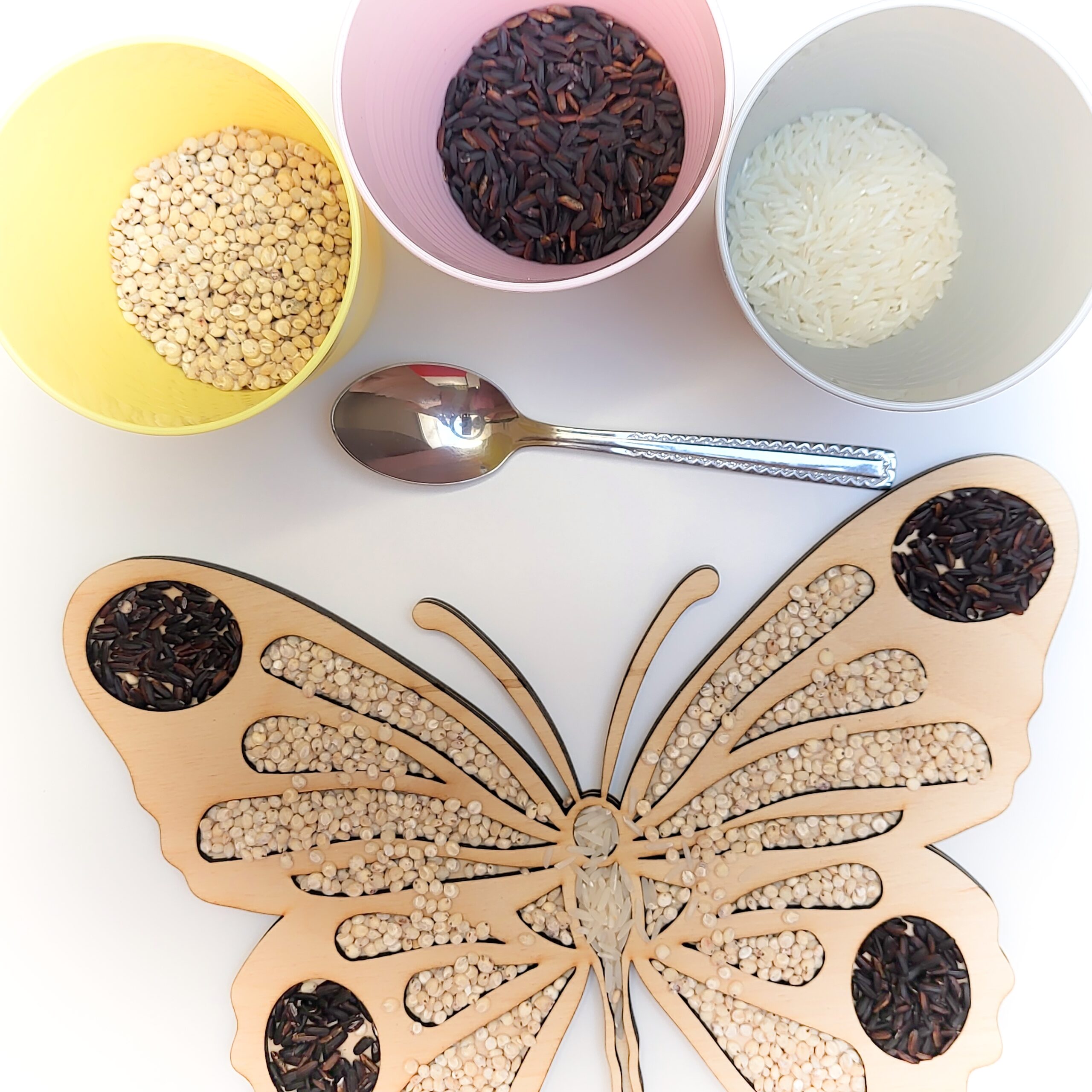 Vysypávací tácek nabízí nekonečné možnosti pro hru a učení. Můžete ho s dětmi naplnit různými materiály, které najdete doma (různobarevné korálky, knoflíky, rýže, cizrna či čočka) či venku v přírodě (kamínky, písek, tráva a podobně).