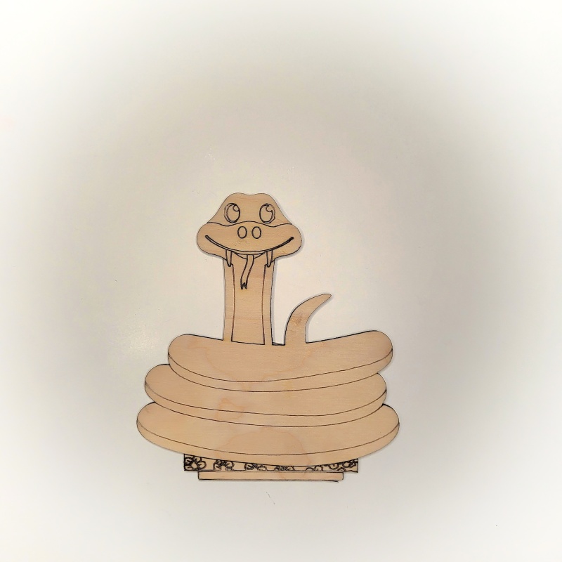Po dotvoření můžete výřezem snadno ozdobit dětský pokojíček – součástí výřezu je totiž stojánek o rozměru 10 x 5 cm, kam lze hada dobře postavit (zasune se do drážky). Pro silnější upevnění dřevěného výřezu hada do stojánku můžete použít lepidlo na dřevo nebo tavnou pistoli.