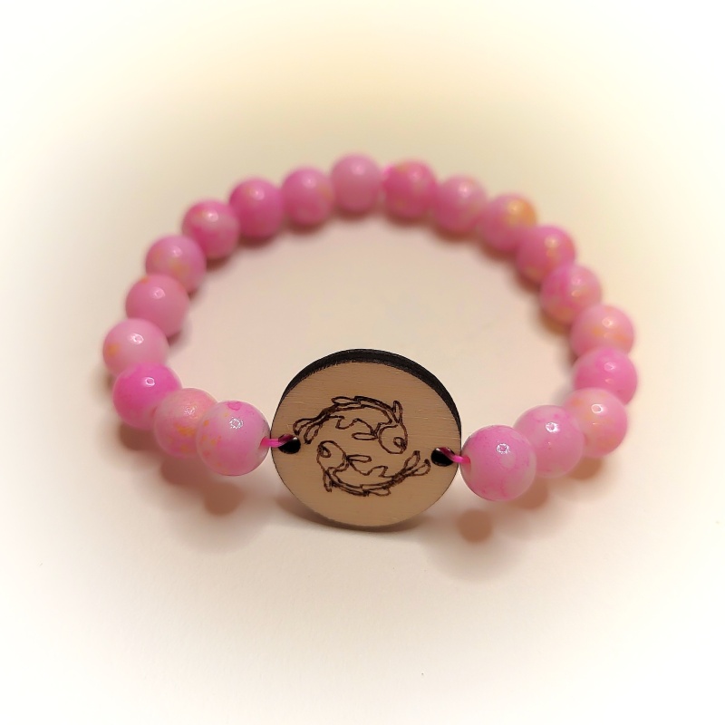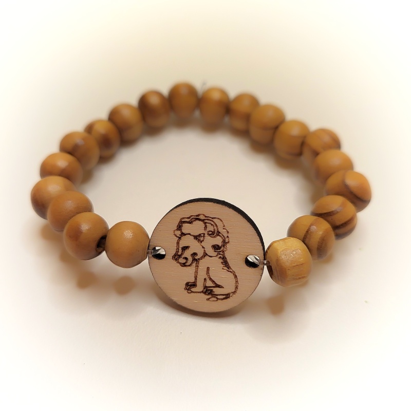 Přívěsek na náramek na dřevěném podkladu o velikosti 2 x 2 cm (a tloušťce 3 mm) je určený k navlékání (má po stranách dva otvory o velikosti 2 mm) mezi korálky.