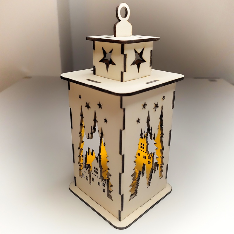 Vánoční lucerna s motivem stromečků, domečků a hvězdiček je velká 19 x 8 cm, je slepená a na dně má otvor pro vložení čajové svíčky. Jelikož se jedná o dřevěný výrobek, doporučujeme používat LED čajovou svíčku.