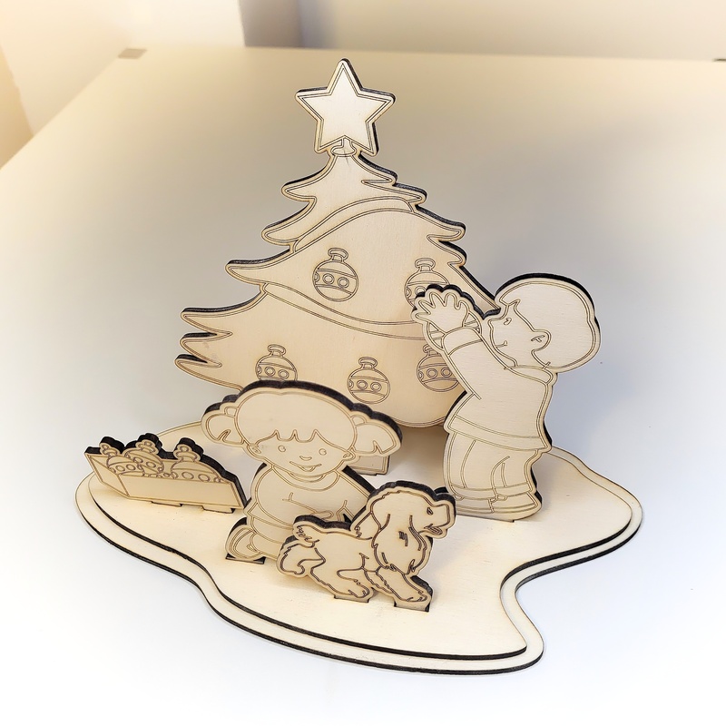 Dřevěná vánoční omalovánka s motivem zdobení vánočního stromečku dětmi je vyrobena ze 4mm překližky a má rozměry 18 x 24 cm. Tato kreativní dekorace na tvoření nadchne každé malé dítě a zkrátí mu v době adventu čekání na Ježíška. Je přírodní, odolná a bezpečná, tudíž ideální na tvoření s dětmi.