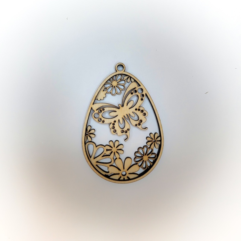 Dvouvrstvé velikonoční vejce z překližky s motivem motýla má velikost 8 x 5,5 cm a šířku 0,6 cm.
